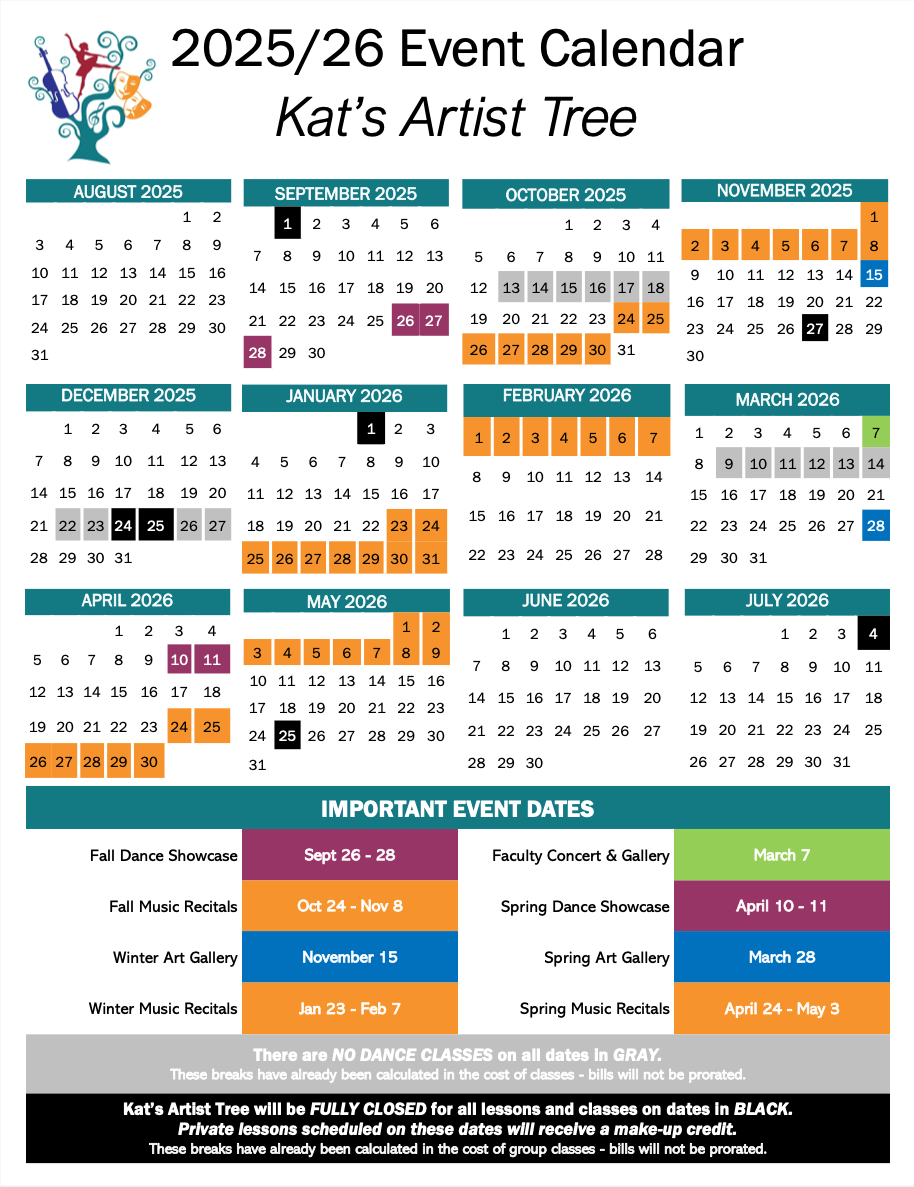 Throughout the school year, students participate in Dance Showcases performed in Kat’s Artist Tree’s Theater. We look forward to celebrating all our students have learned in class and seeing them shine on stage! Performances are an exciting and valuable part of a student’s dance education. Participation is a mandatory part of the dance curriculum.